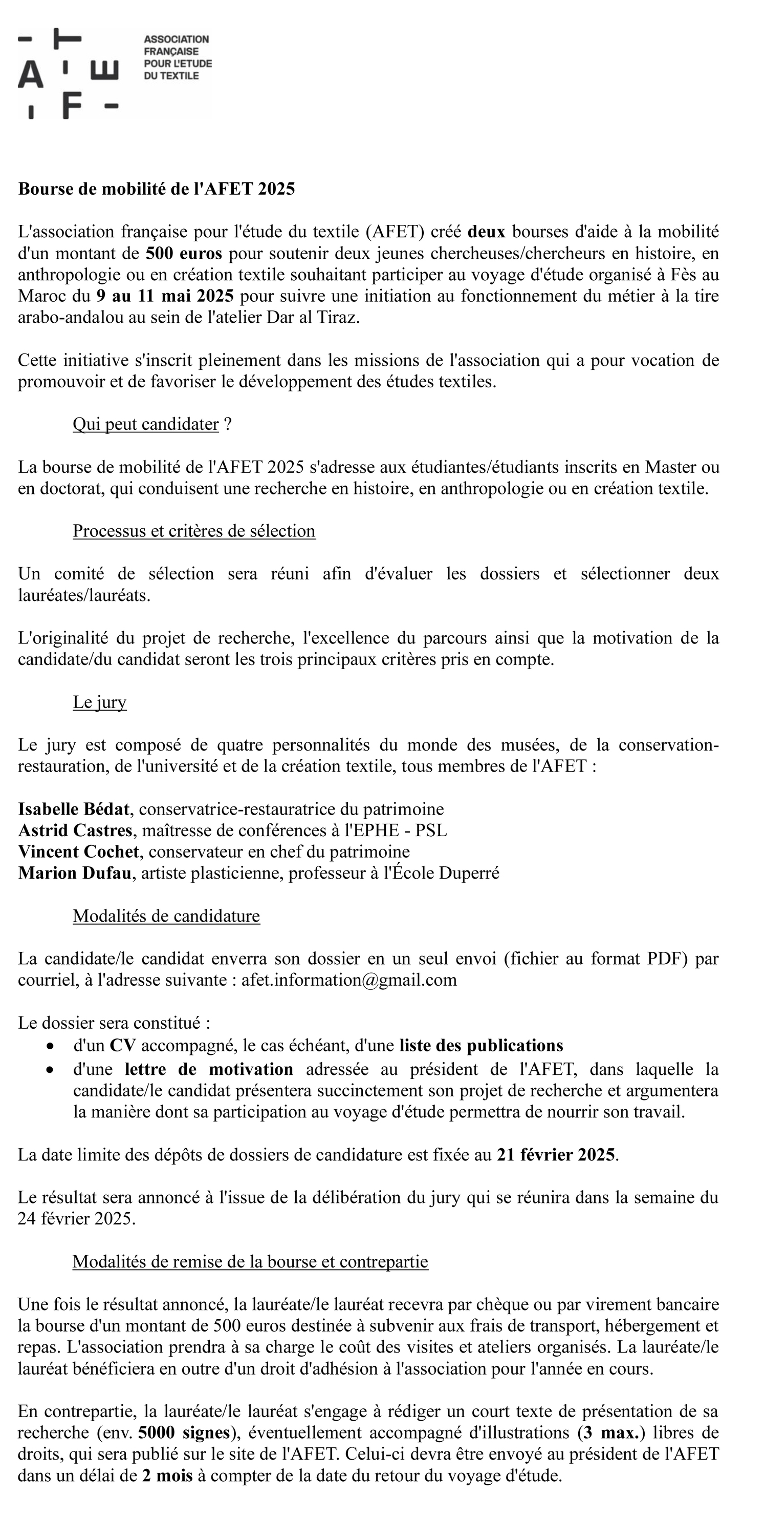 La bourse de mobilité de l'AFET 2025 s'adresse aux étudiantes/étudiants inscrits en Master ou en doctorat, qui conduisent une recherche en histoire, en anthropologie ou en création textile. Les étudiants sélectionnés pourront suivre une initiation au fonctionnement du métier à la tire arabo-andalou au sein de l'atelier Dar Al Tiraz.