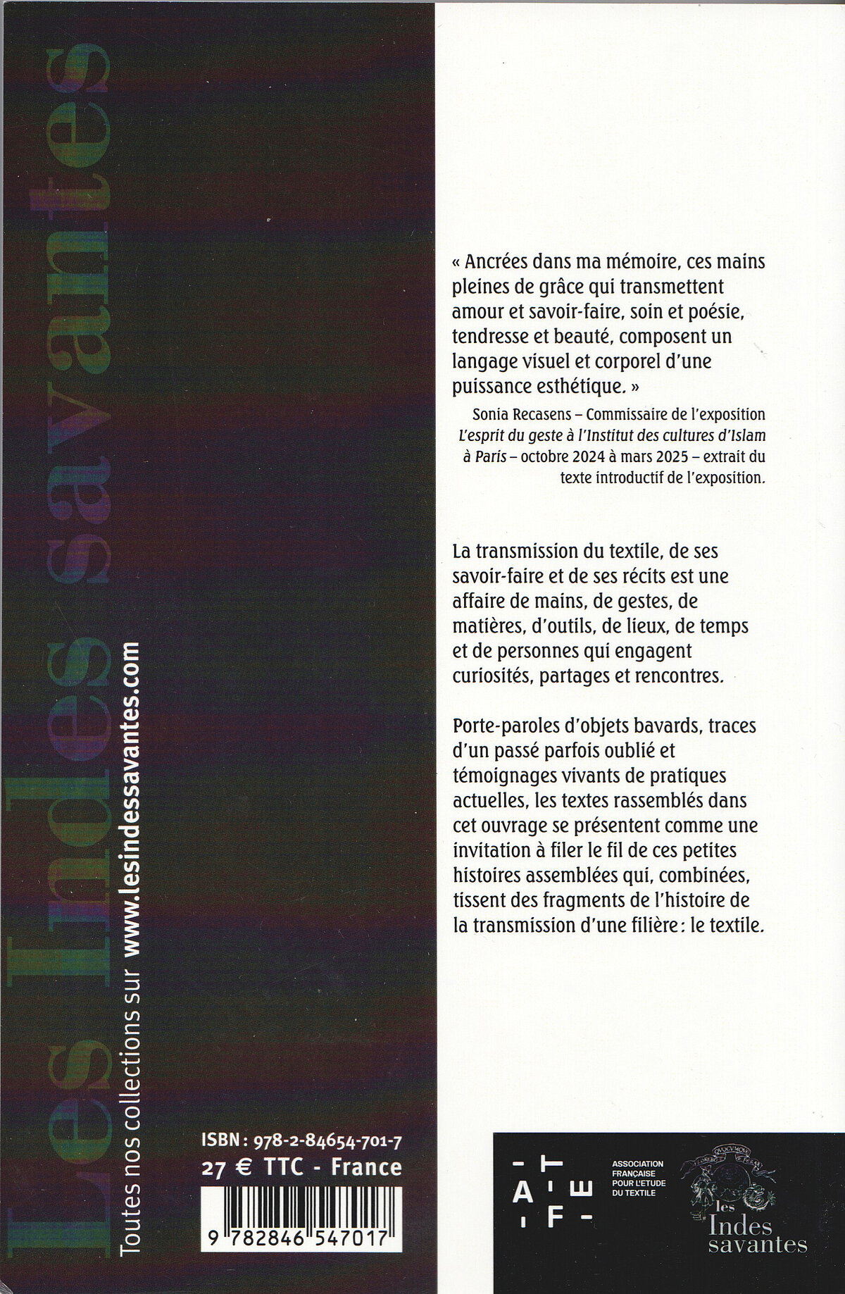 La transmission textile, de ses savoir-faire et de ses récits est une affaire de mains, de gestes, de matières, d'outils, de lieux, de temps et de personnes qui engagent curiosités, partages et rencontres.